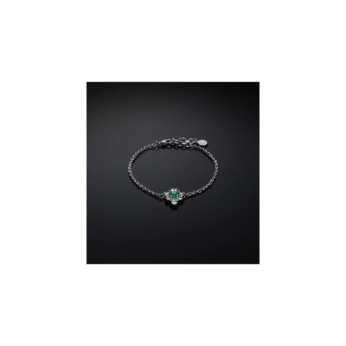 Bracciale della collezione Emerald con zirconi bianchi e zircone verde a forma di cuore. Chiusura a moschettone.