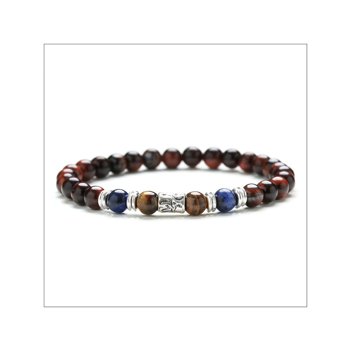 Bracciale elastico realizzato a mano con pietre Occhio di Tigre Rosso e Sodalite e dettagli realizzati in argento 925.