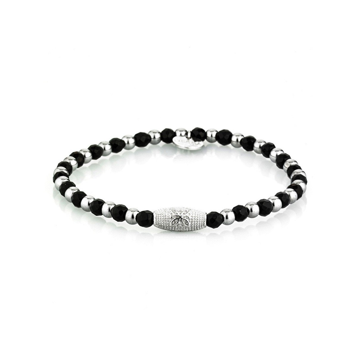 Bracciale con elastico realizzato a mano con Onice sfaccettato, Ematite e Argento 925, Logo in Argento 925.