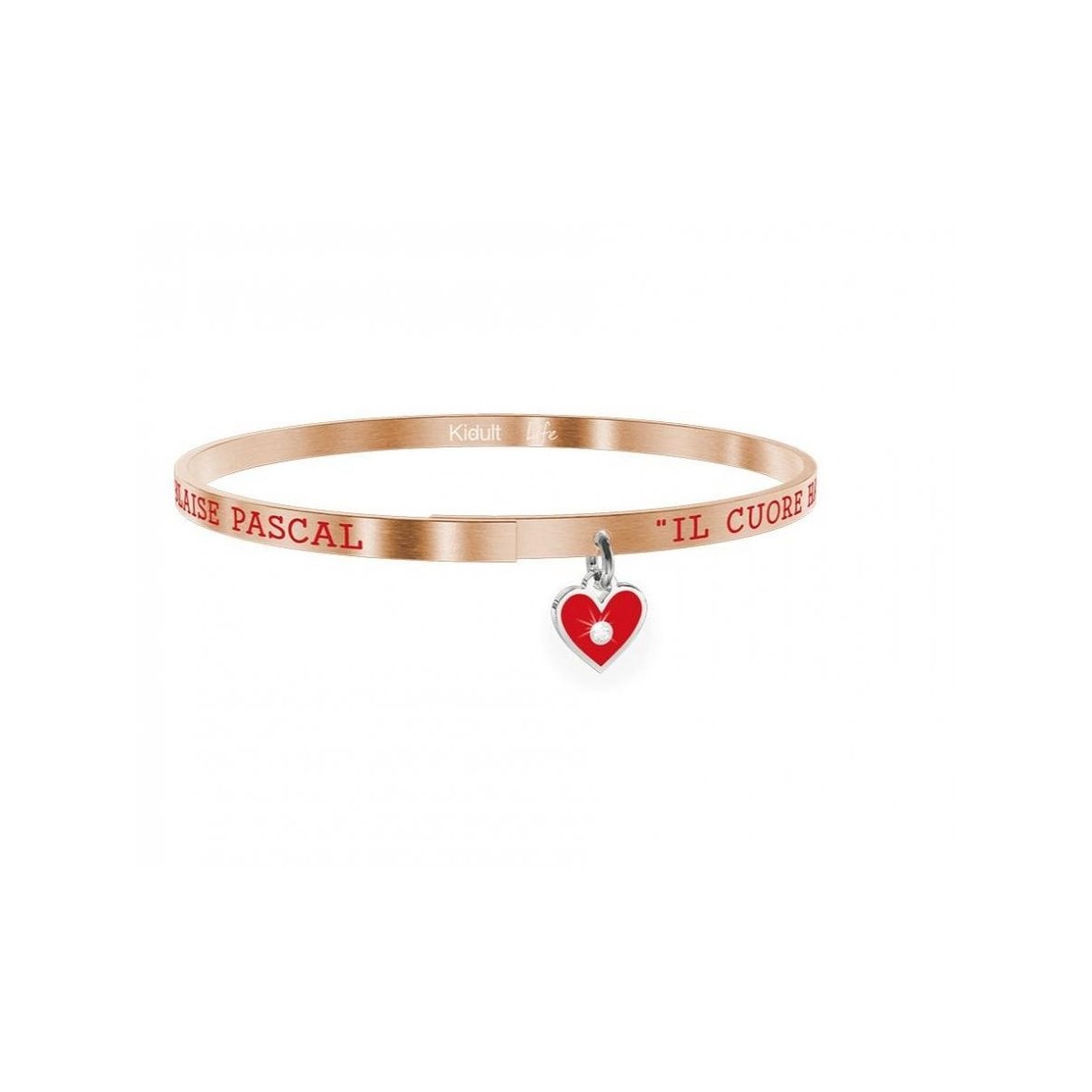 Bangle sottile in acciaio satinato color oro rosa con scritta e piccolo ciondolo a cuore smaltato rosso.