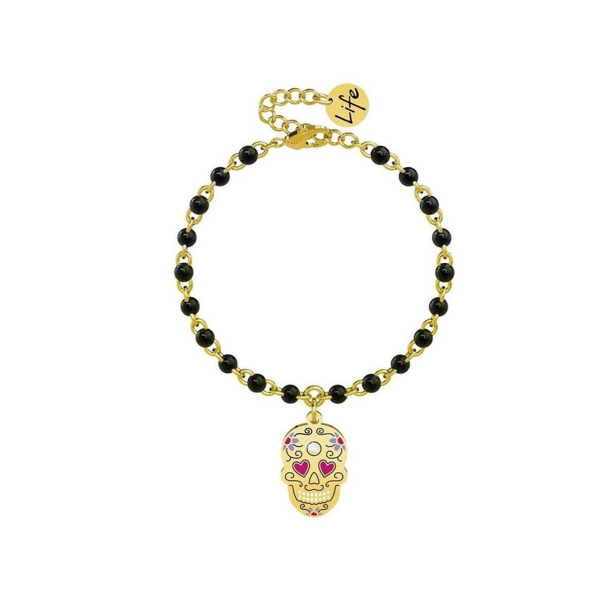 Bracciale in acciaio color oro giallo con ciondolo a forma di teschio messicano smaltato e catena rolò con inserimenti in smalto nero.