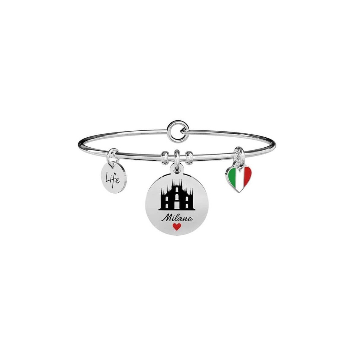 Bangle in acciaio con ciondoli tondi e piccolo cuore smaltato.