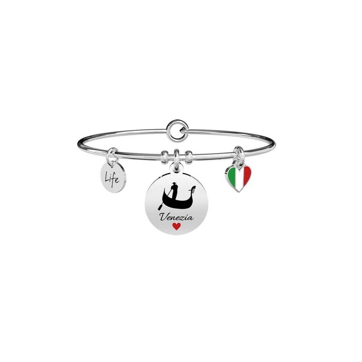 Bangle in acciaio con ciondoli tondi e piccolo cuore smaltato.