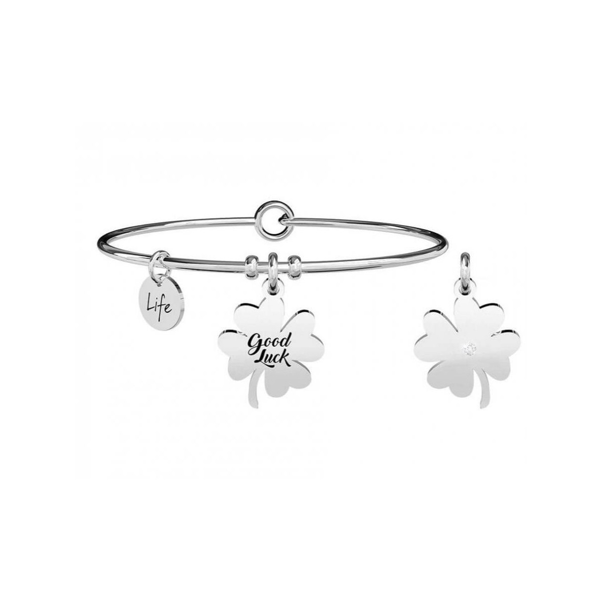 Bangle in acciaio con ciondolo a quadrifoglio.
