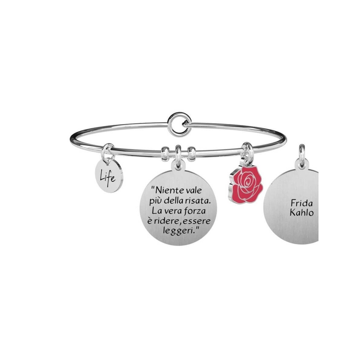 Frida Kahlo Official Collection Bangle in acciaio con ciondoli satinato tondo e a rosa smaltata rossa.