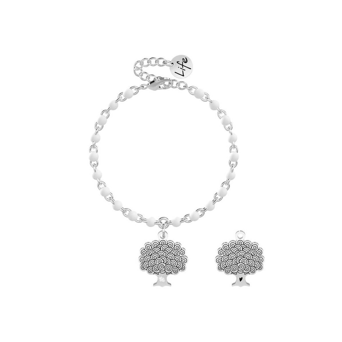Bracciale in acciaio con ciondolo ad albero e catena rolò con inserimenti in smalto bianco.