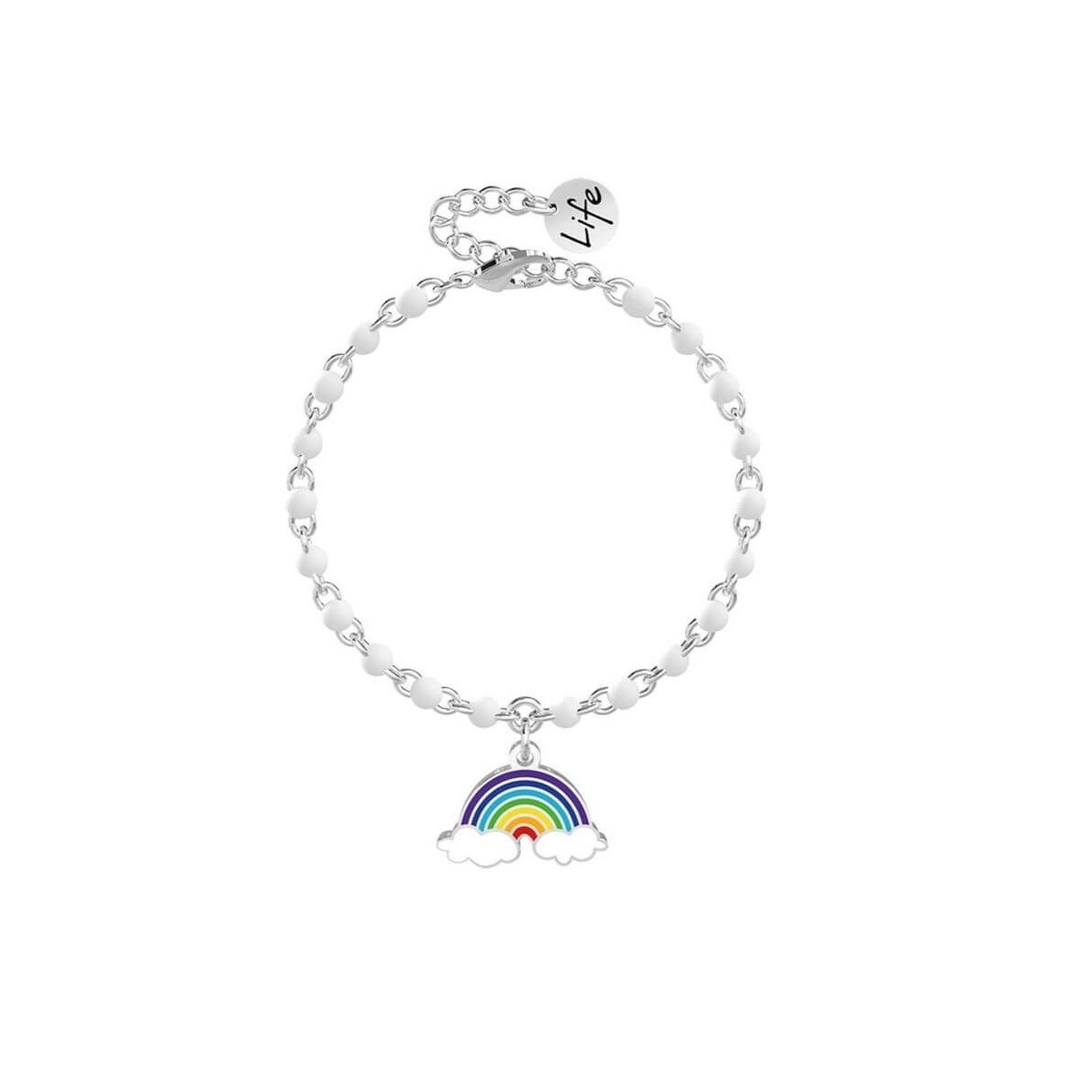 Bracciale in acciaio con ciondolo arcobaleno smaltato e catena rolò con inserimenti in smalto bianco.
