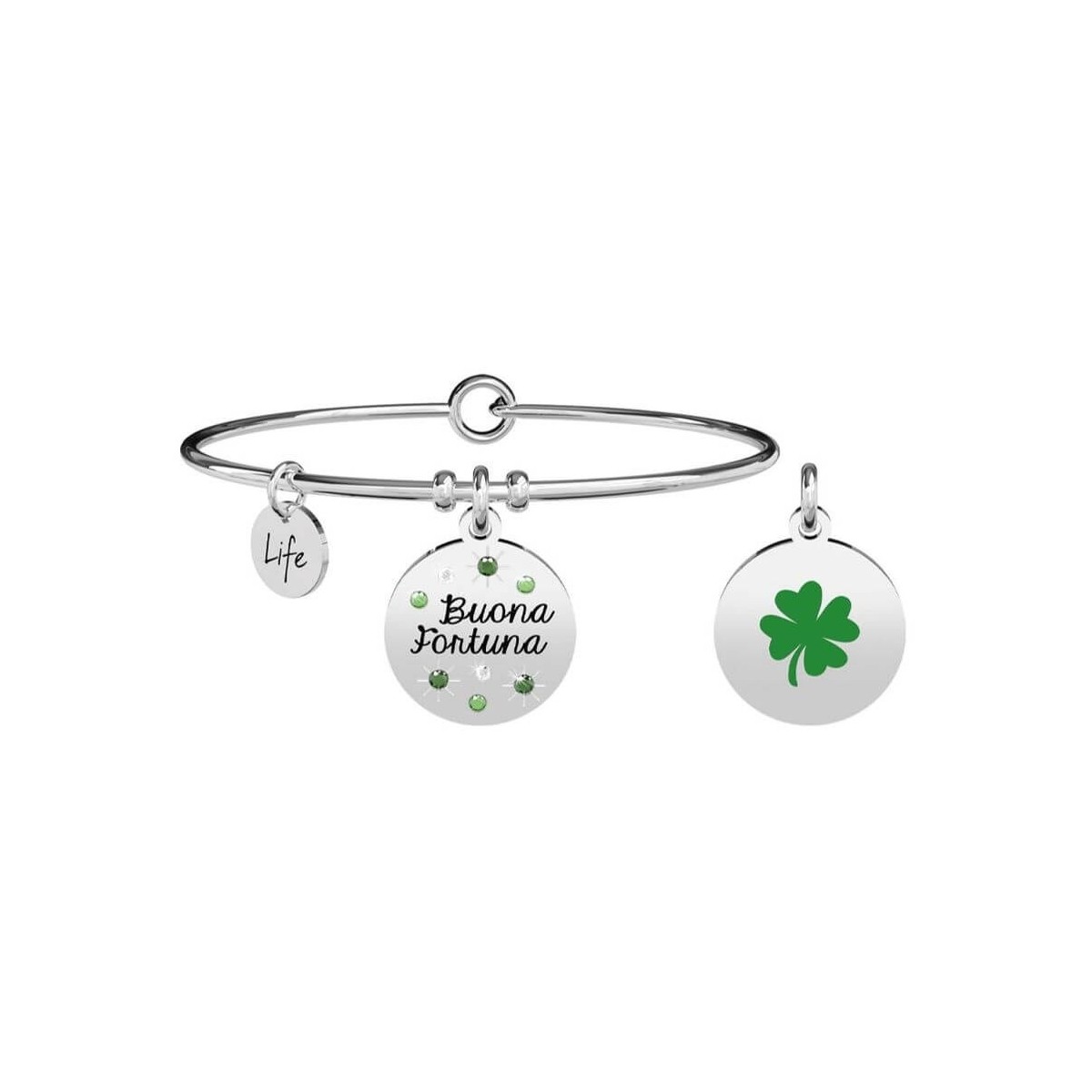 Bangle in acciaio con ciondolo tondo con cristalli colorati e smalto verde a forma di quadrifoglio.
