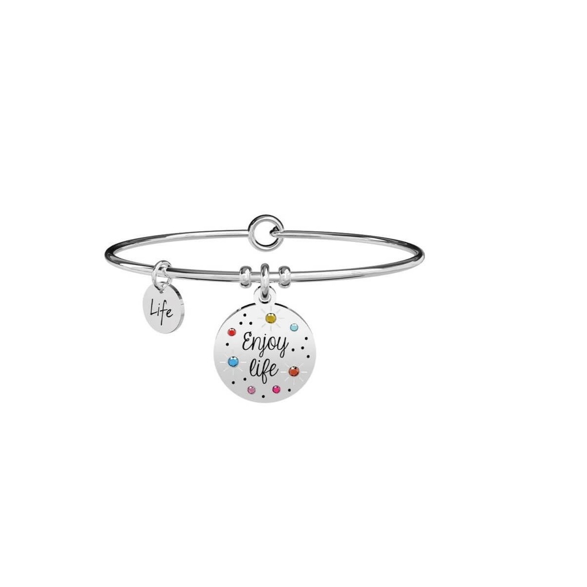 Bangle in acciaio con ciondolo tondo con cristalli colorati.