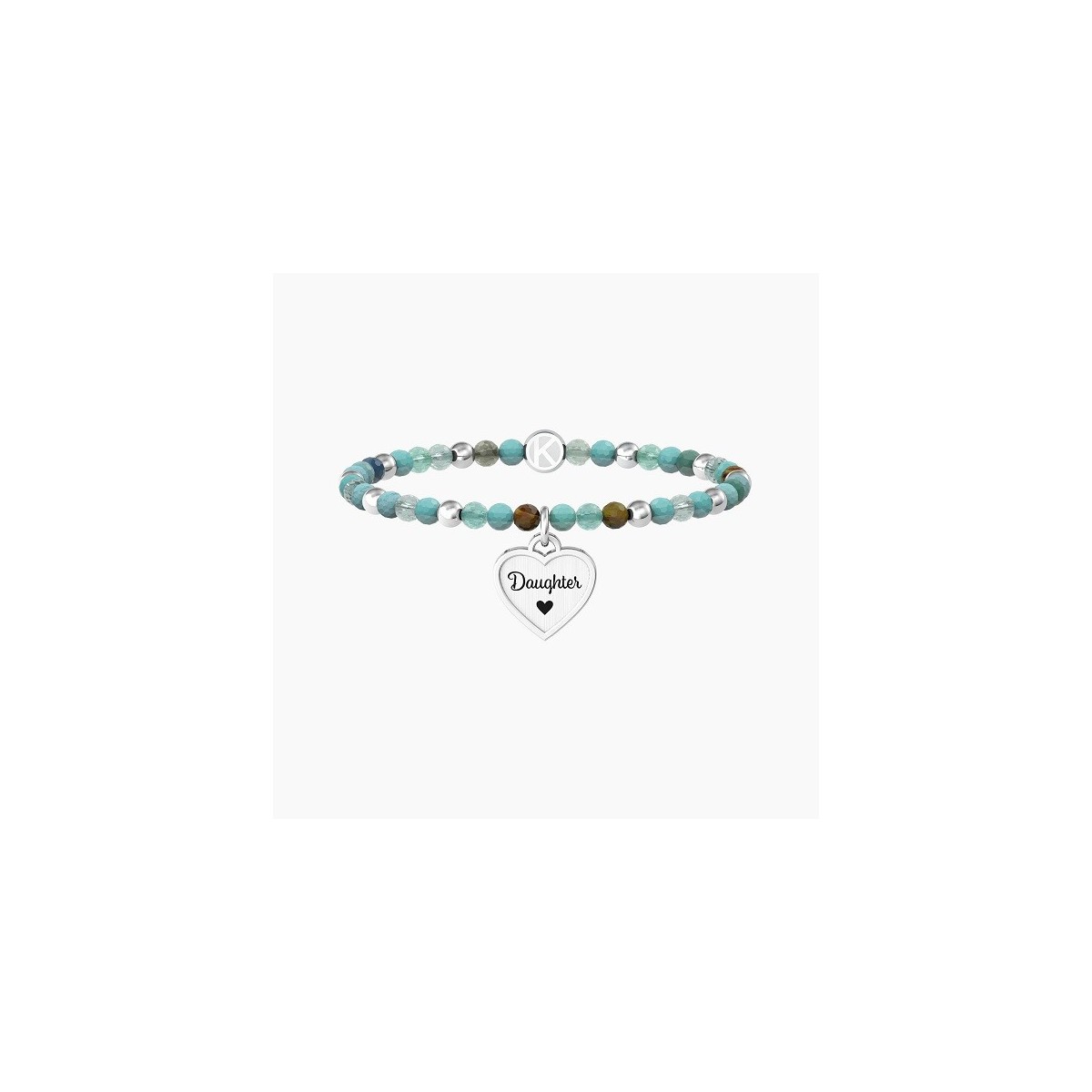 Bracciale elastico da donna Kidult della linea Family, realizzato in acciaio lucido e satinato con agata striata multicolore e ciondolo lucido e satinato a forma di cuore e scritta "Daughter".