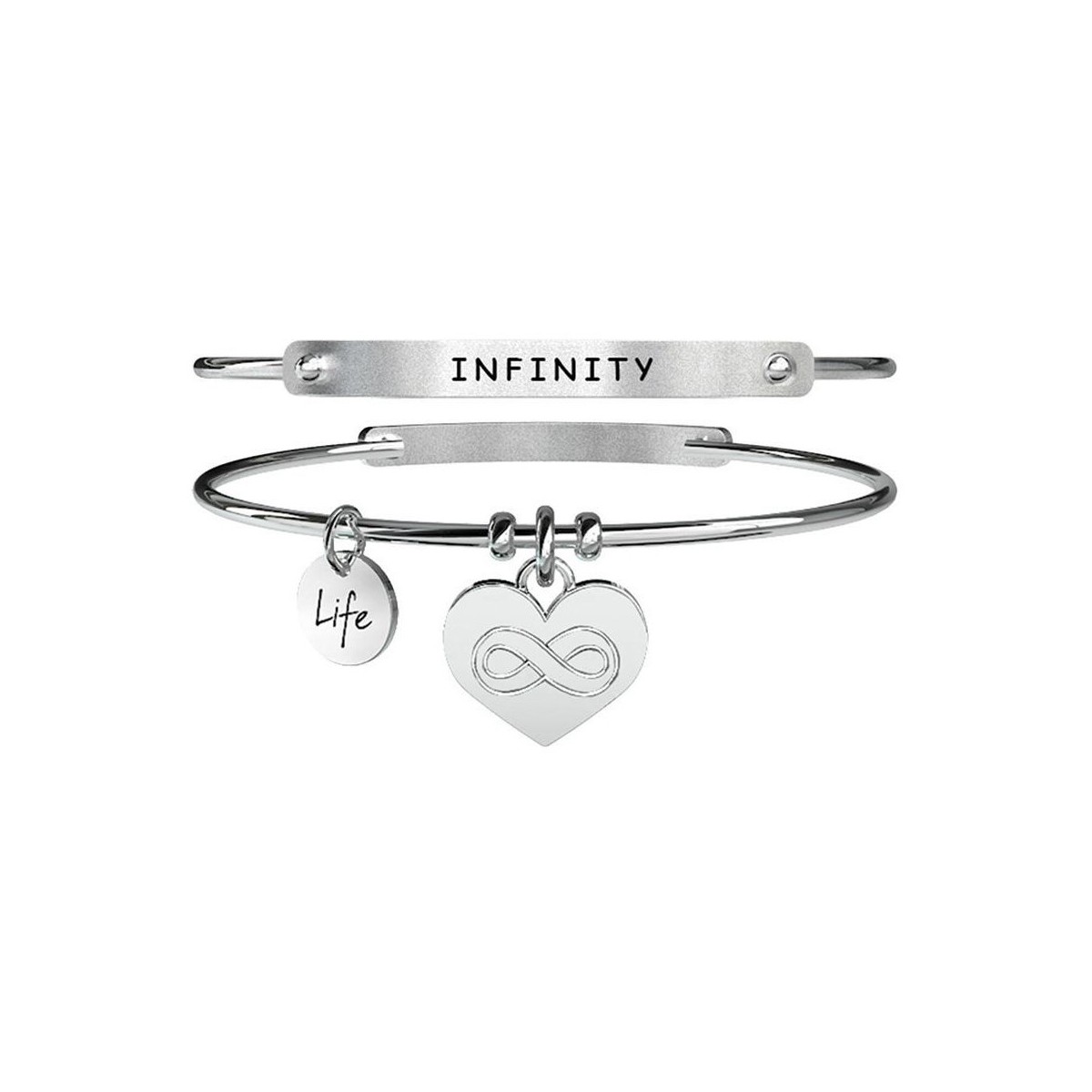 Non durerà il tempo di una stagione, di un anno e nemmeno di una vita. Dove tutto nasce, cresce, finisce, solo una cosa durerà per sempre...il vero amore.Ciondolo tondo con scritta "Life", ciondolo cuore con infinito e piastrina con scritta Infinity.