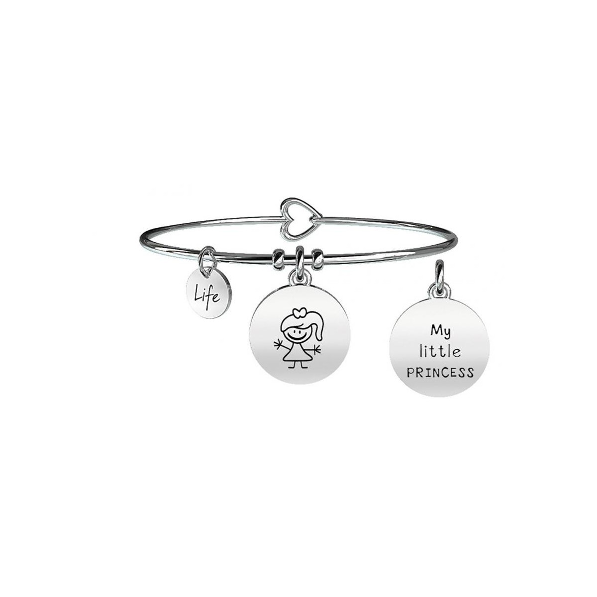 Bracciale in acciaio rigido con pendenti mi piccola principessa rodiato con chiusura a cuore