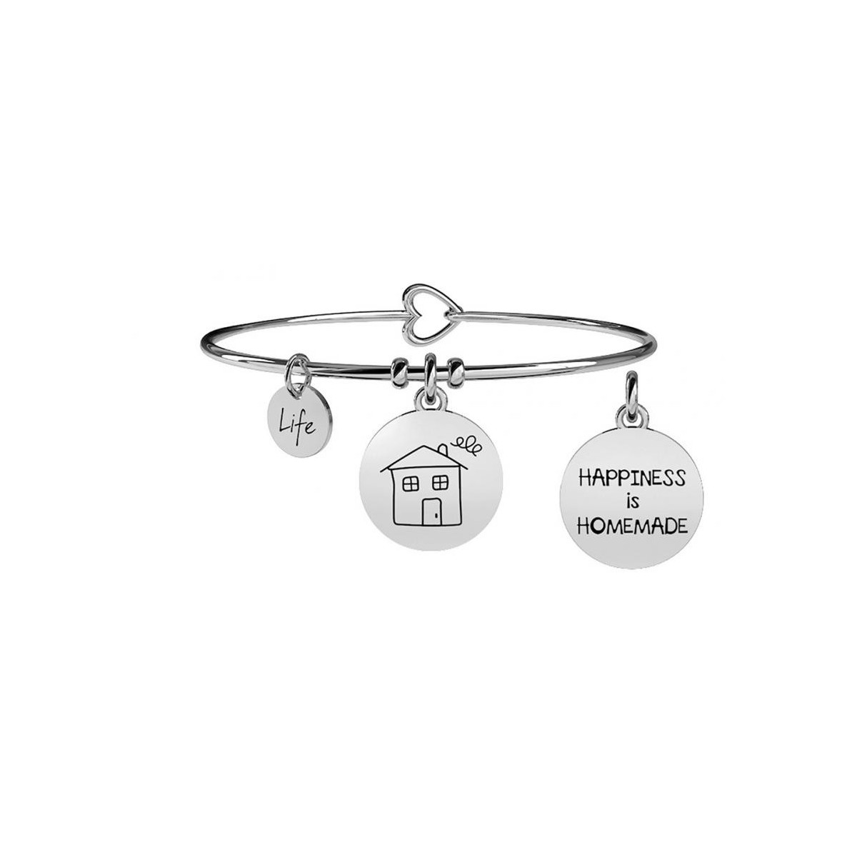 Bracciale in acciaio rigido con pendenti Happiness is homemade rodiato chiusura cuore