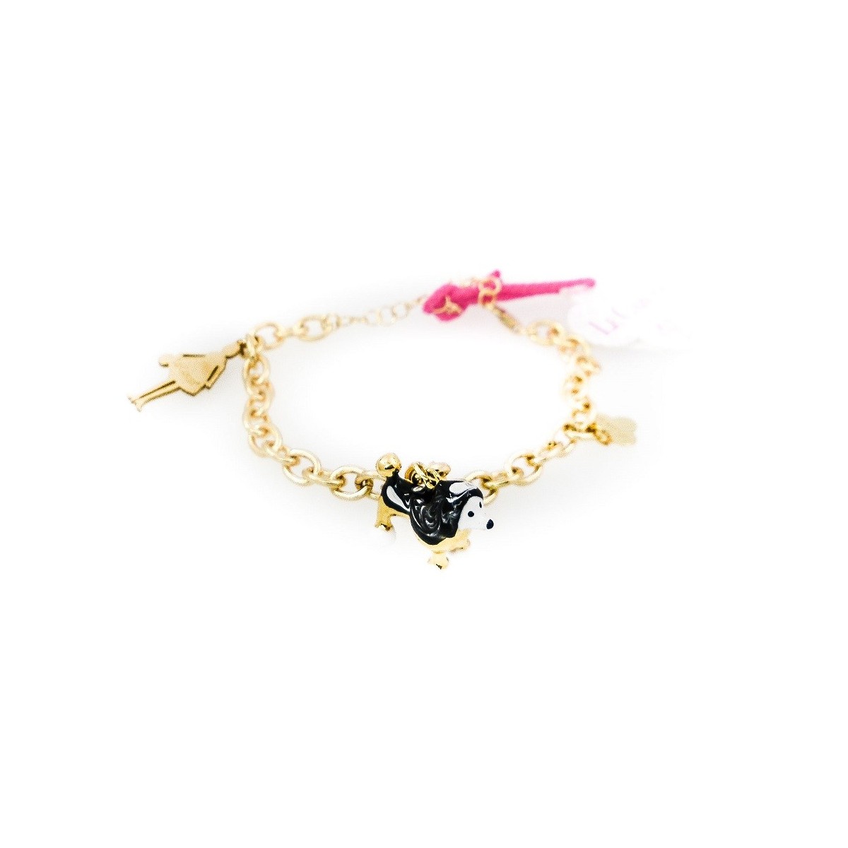 Bracciale in metallo dorato con cherms cane smaltato nero e bambola