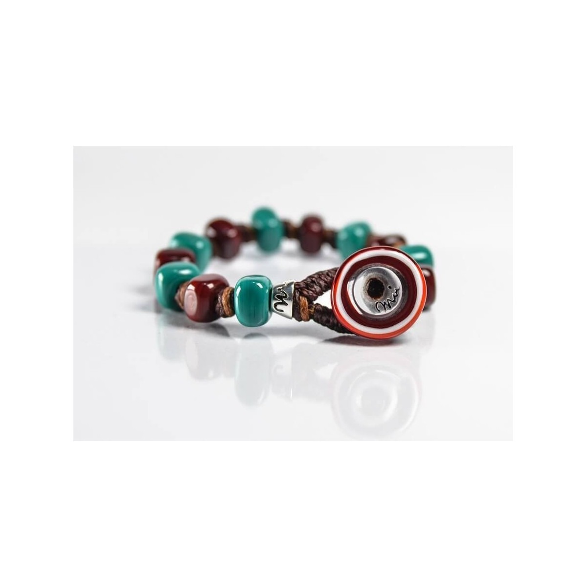 Il braccialetto Moi Ottanio è realizzato artigianalmente in vetro di murano e corda.
