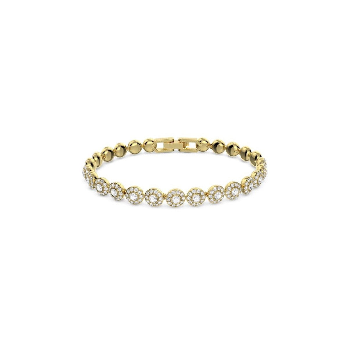 Bracciale da donna Swarovski della collezione Angelic realizzato in metallo placcato oro giallo. Un bracciale dallo stile intramontabile che propone una fila di Clear Crystal dal taglio circolare, ognuno incorniciato dal pavé di cristalli bianchi.