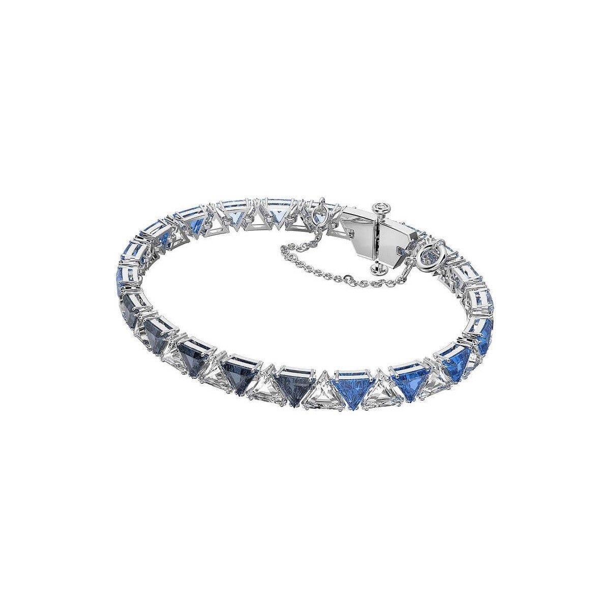 Bracciale da donna Swarovski, della collezione Millenia Ortyx, realizzato in metallo con un elegante placcatura rodiata e serie di cristalli dal taglio triangle di colore azzurro e blu che rendono questo bracciale unico ed originale. Chiusura con gancio ad W.
