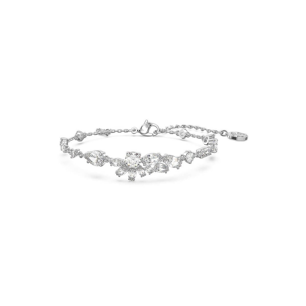 Bracciale femminile Swarovsky, della collezione Gema, realizzato in metallo rodiato e composto da una serie di cristalli bianchi dalle forme geometriche diverse che si compongono in un motivo centrale floreale asimmetrico. Chiusura a moschettone regolabile.