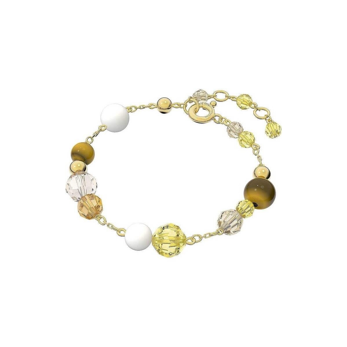 Bracciale da donna Swarovski, della collezione Somnia, realizzata in un elegante placcatura color oro giallo ed impreziosito da un'alternanza di cristalli, perle ed occhio di tigre nei colori caldi della terra, perfetto per la palette autunno.