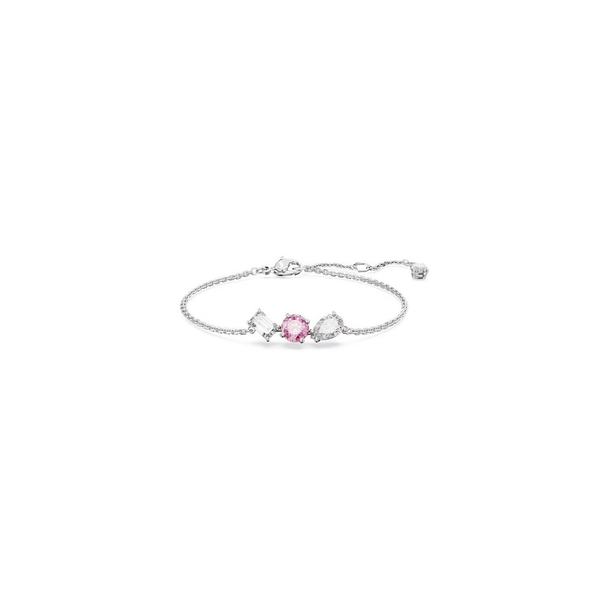 Bracciale da donna Swarovski, della collezione Mesmera, placcato rodio, montato su una delicata catena con un allungamento pendente e presenta un trio di Swarovski Zirconia di diverse forme montati a griffe, che comprendono anche una pietra centrale rosa dal taglio Octagon-step. Chiusura a moschettone con allungamento.