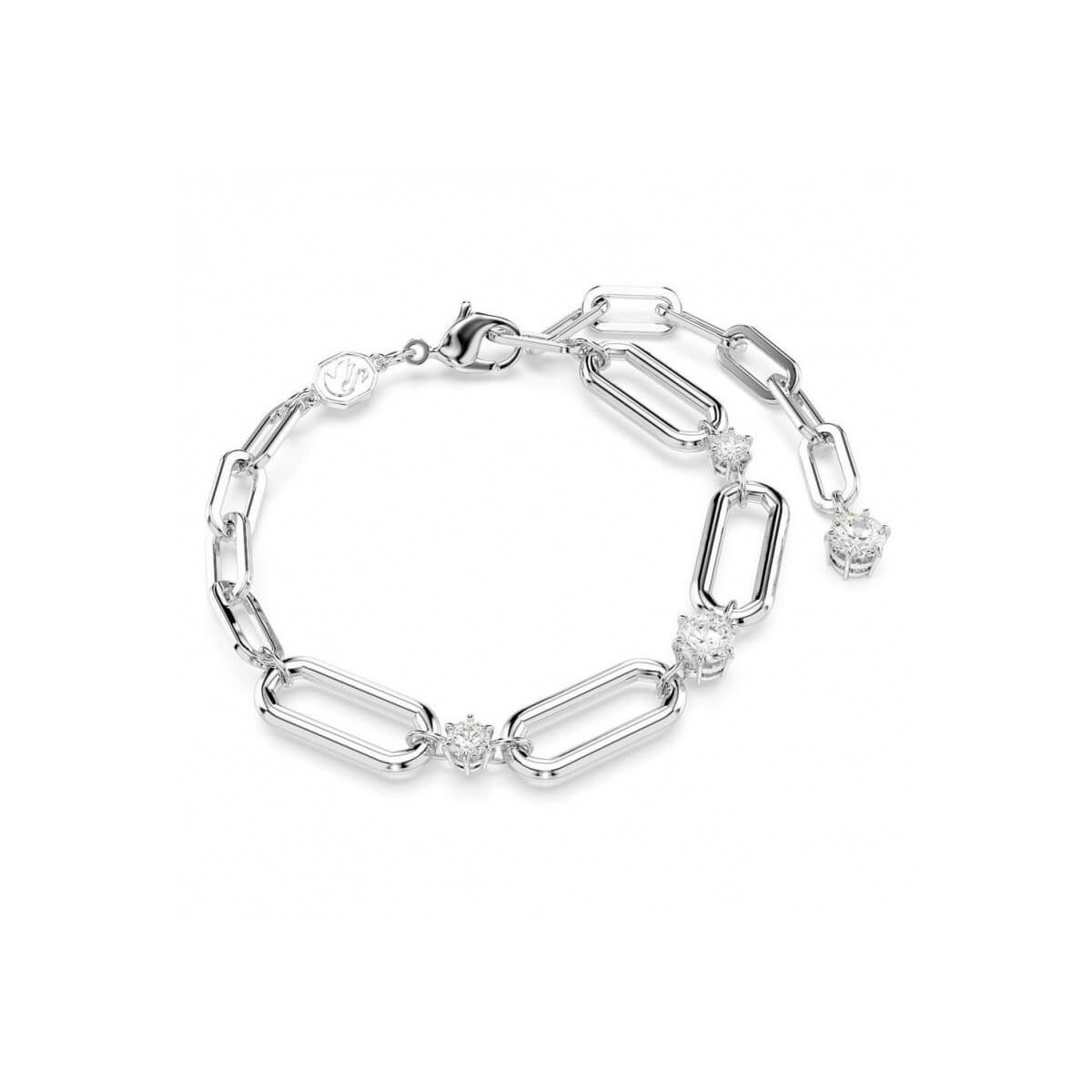Bracciale femminile Swarovski, della collezione Constella, composto da una catena a maglie grandi dal design industriale in una sofisticata placcatura rodio e Swarovski Zirconia incastonati a griffe tra le maglie centrali. Chiusura a moschettone regolabile con singolo Zirconia Swarovski.