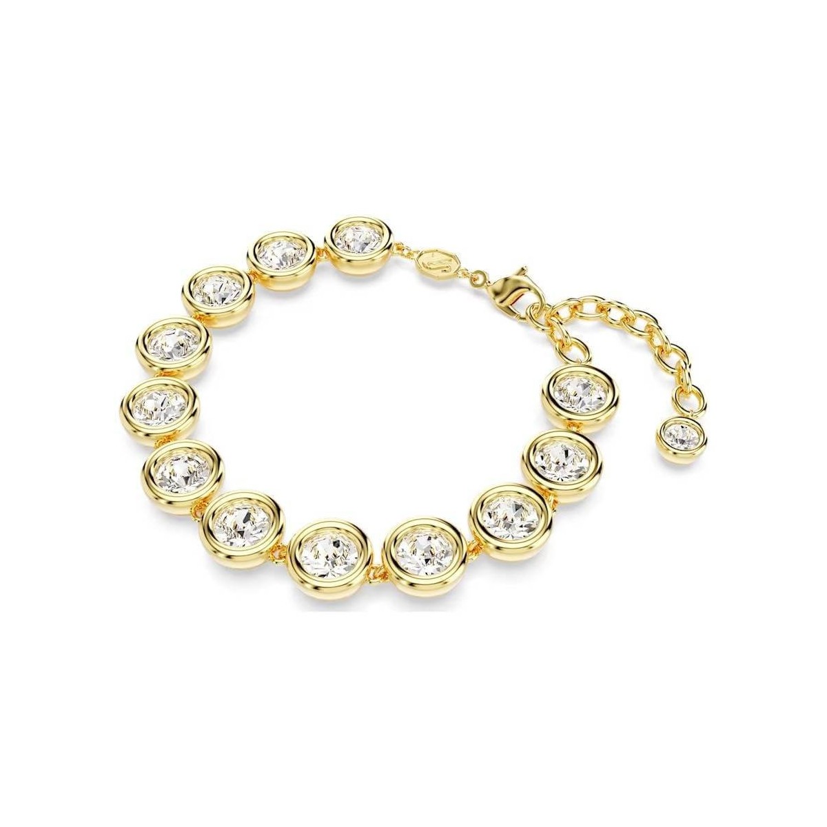 Bracciale femminile Swarovski, della collezione Imber, composto da una fila di cristalli taglio tondo incastonati su montatura bombata realizzata in un elegante placcatura color oro giallo . Chiusura a moschettone regolabile con singolo Zirconia Swarovski.