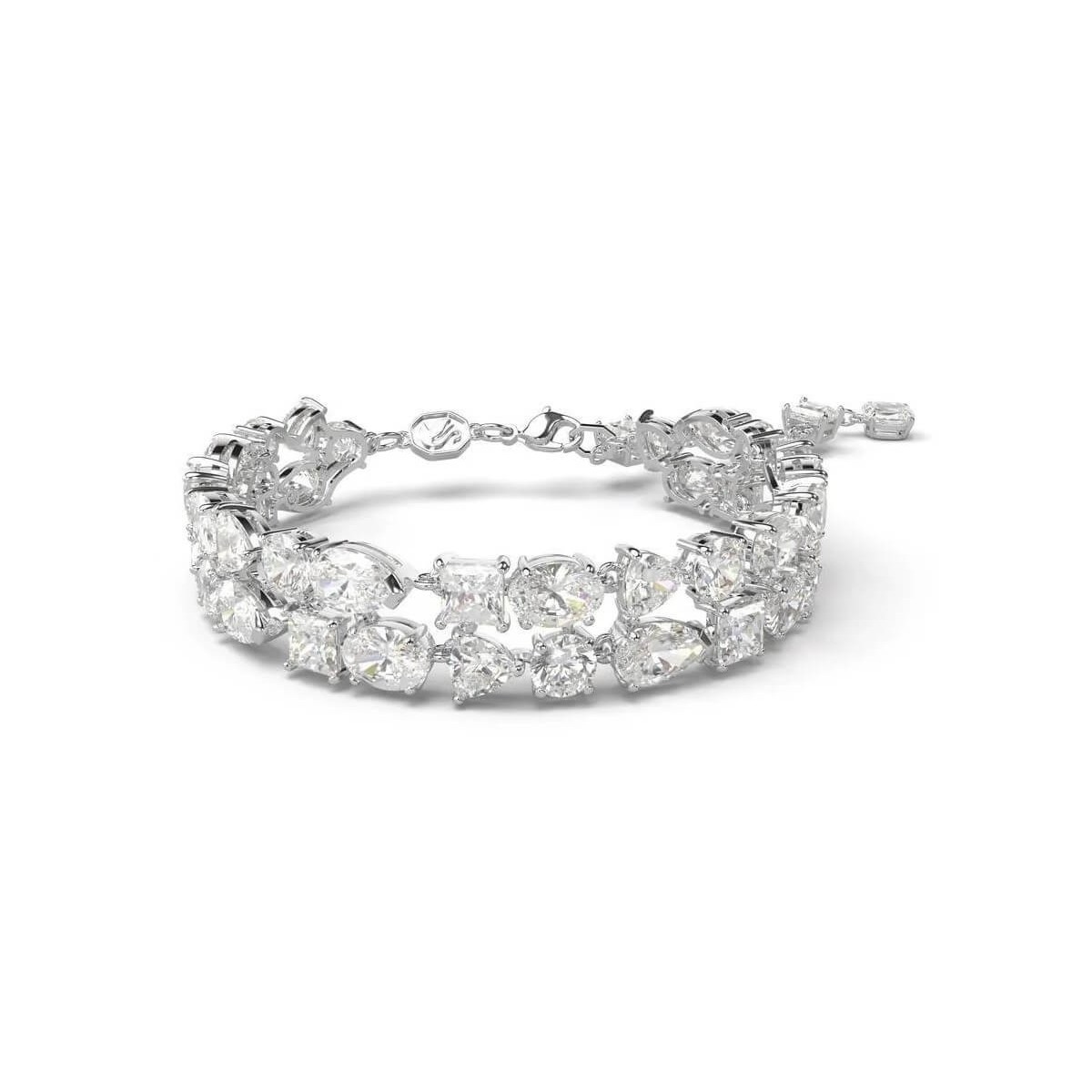 Bracciale da donna Swarovski della collezione Mesmera realizzato in metallo placcato rodio. Presenta una montatura a griffe in un suggestivo mix di tagli rifiniti con chiusura a moschettone. L'allungamento pendente presenta una fila di Swarovski Zirconia.