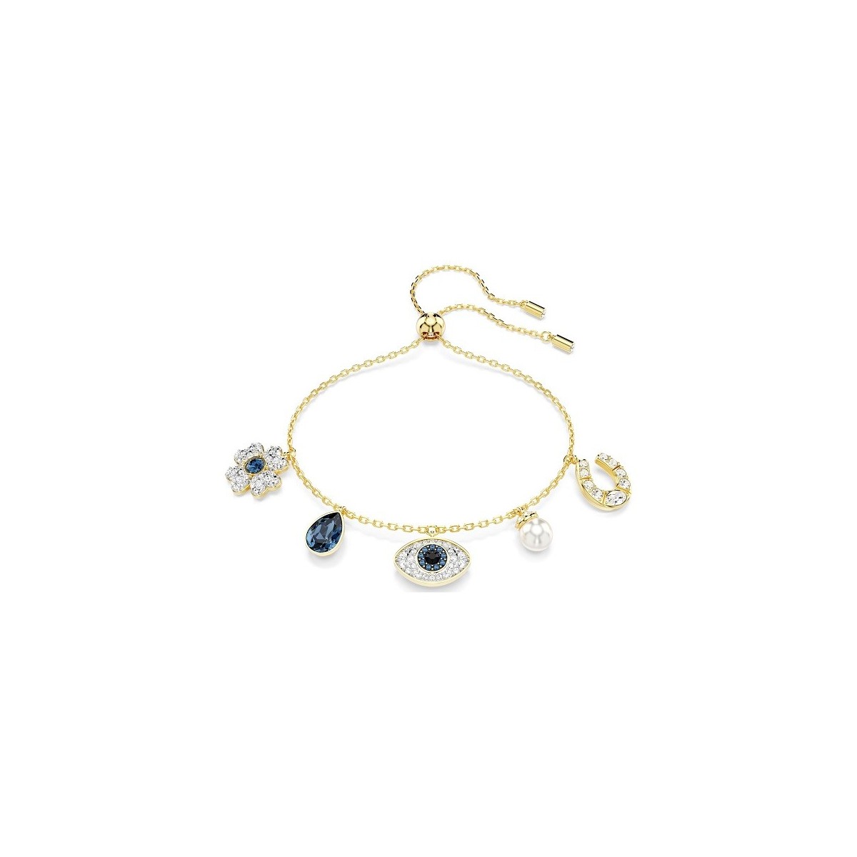 Bracciale firmato Swarovski appartenente alla collezione Symbolica. Il bracciale presenta un catena con 5 elementi pendenti incastonati, tra cui un quadrifoglio, una goccia blu, un crystal pearl con pavè, un ferro di cavallo e un occhio di Allah bombato.