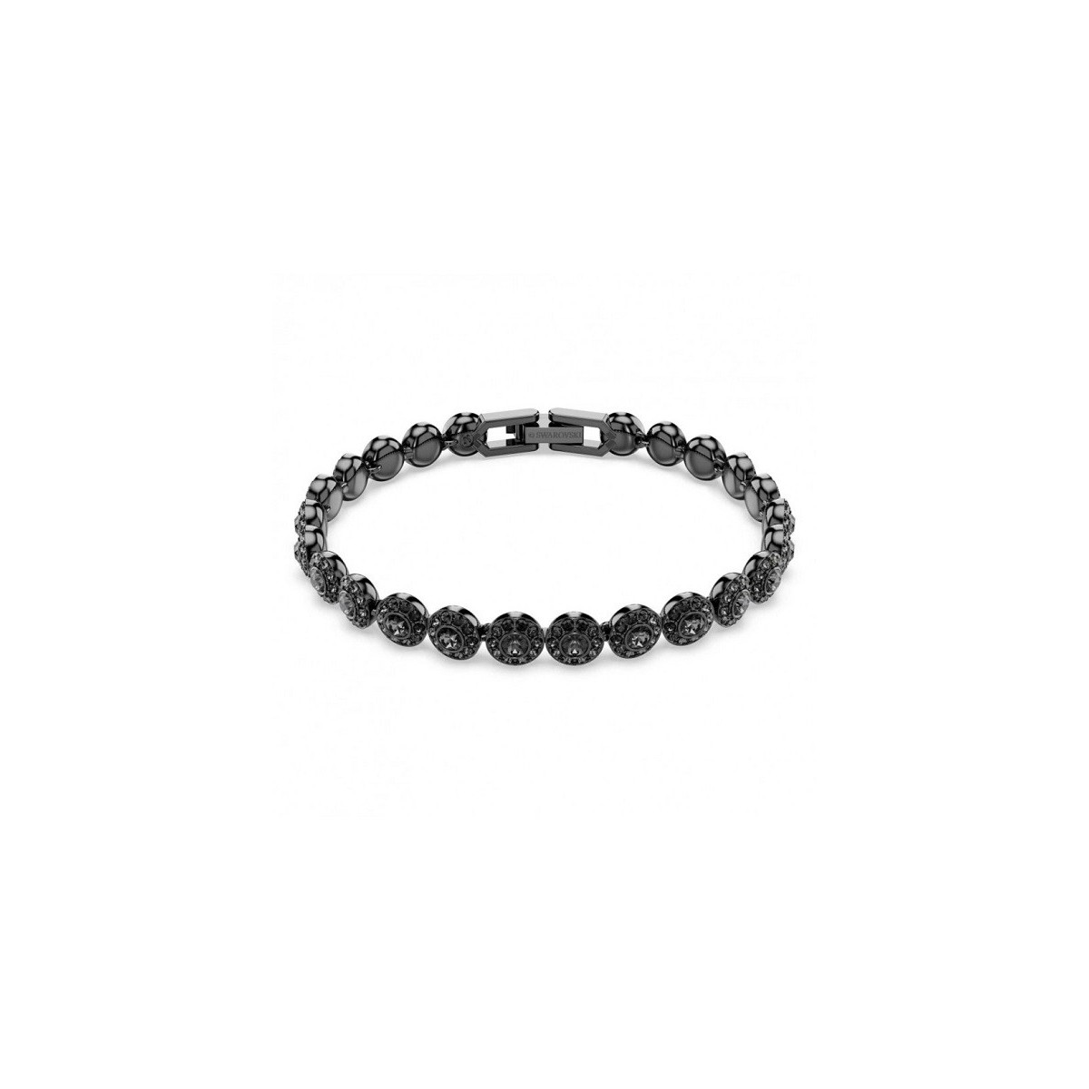 Bracciale tennis firmato Swarovski appartenente alla collezione Angelic. Il braccialetto placcato rutenio nero, presenta singole maglie nel centro di ognuna delle quali è incastonato un cristallo Clear Crystal a taglio circolare, ognuno incorniciato dal pavé di Clear Crystal. Il gioiello si abbina perfettamente agli altri accessori della collezione Angelic.