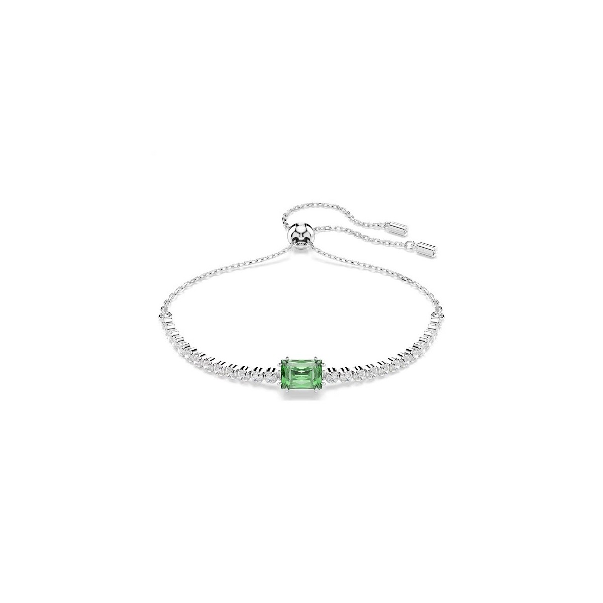 Bracciale tennis, taglio misto, della collezione Matrix, da donna Swarovski, esaltano l'interazione tra geometria e luce. Realizzato con placcatura rodio presenta una fila uniforme di Swarovski Zirconia trasparenti ed è impreziosito da una Swarovski Zirconia verde taglio baguette al centro.