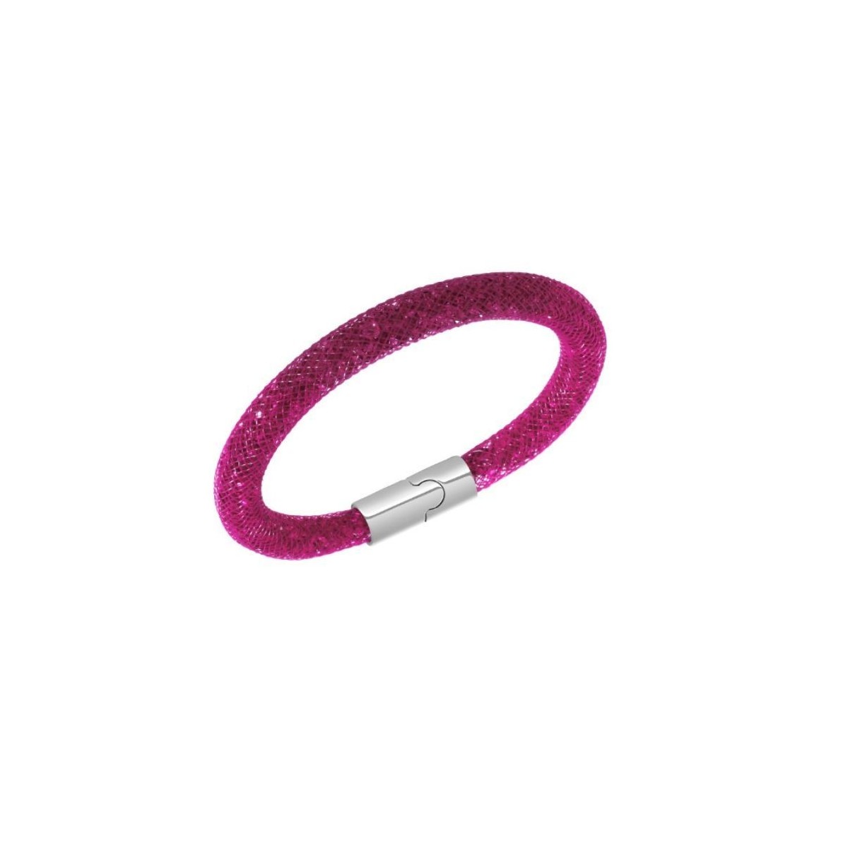 Allegro e femminile, l’irrinunciabile bracciale è perfetto da abbinare ad altri gioielli da polso. Il tubolare fucsia a rete di nylon trattiene una miriade di minuti cristalli tono su tono. La creazione è completata da una pratica chiusura magnetica in metallo palladiato ed è disponibile in due lunghezze.