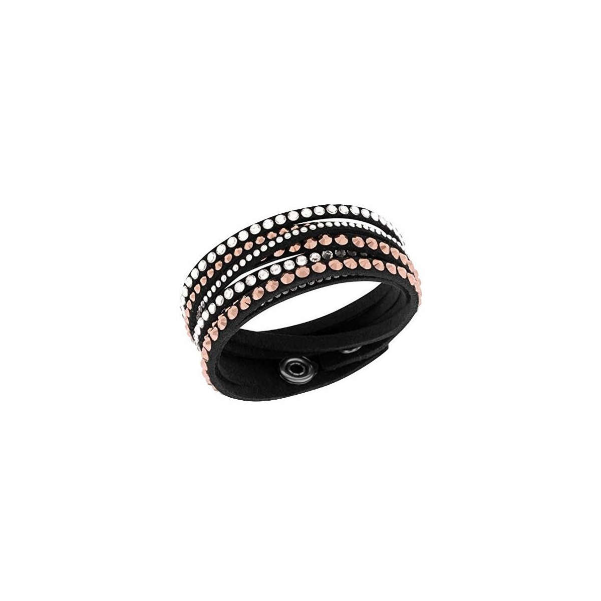 Variazioni sul tema per l’iconico bracciale Slake, qui interpretato con un affascinante alternarsi di cristalli diversi abbinati alla microfibra nera. I due bottoni a pressione della chiusura garantiscono una vestibilità sempre confortevole (36/38 cm).