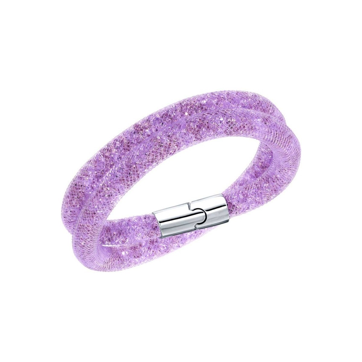 Davvero imperdibile, questa fresca creazione da indossare doppia, come bracciale avvolgente, o come girocollo. Il tubolare di nylon trattiene una miriade di cristalli viola, che definiscono un profilo 3D. La pratica chiusura magnetica è in metallo palladiato. Disponibile in due lunghezze.