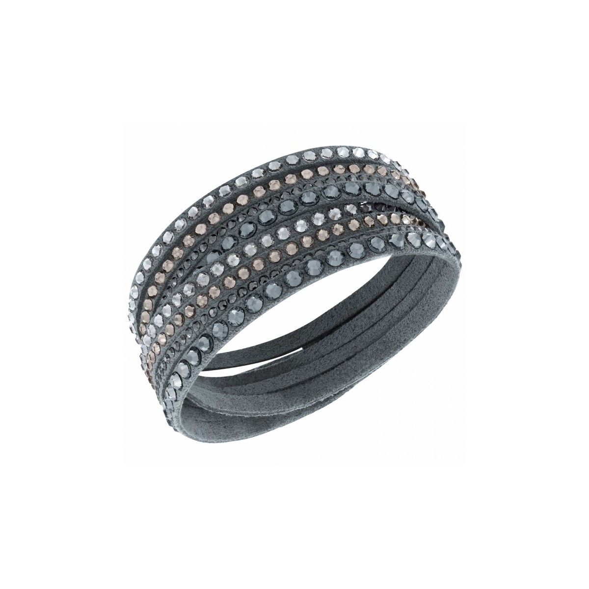 Una versione sportiva e metropolitana va ad aggiungersi all’apprezzatissima collezione Slake. Impreziosito dalla presenza dei cristalli, il bracciale in microfibra grigio ardesia avvolge sinuosamente il polso, definendo uno stile multistrato. La chiusura consiste in due bottoni a pressione impreziositi da Clear Crystal che consentono di regolare la lunghezza (36/38 cm).