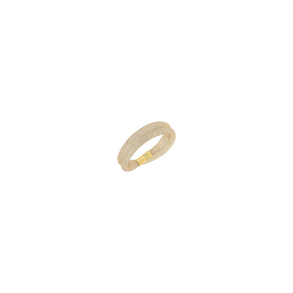 L’irresistibile creazione può essere indossata come bracciale doppio avvolgente, oppure come girocollo. Il tubolare dorato a rete di nylon trattiene una miriade di minuti Clear Crystal e crea un profilo 3D. La pratica chiusura magnetica in metallo placcato oro completa questa proposta moda, disponibile in due lunghezze..