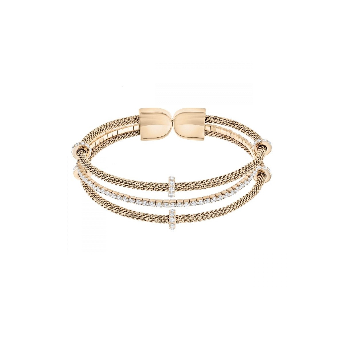 Il bangle sfoggia un profilo stratificato a tris di bracciali sottili, e alterna pavé di Clear Crystal e maglia metallica fine in PVD oro rosa. Una proposta di tendenza dall’architettura contemporanea per un gioiello decisamente attuale. Abbinatelo ad altri bangle per interpretare lo stile multiplo.