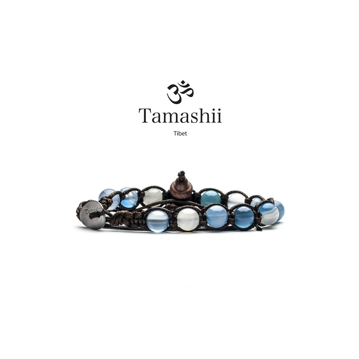 Bracciale a un giro unisex e taglia unica (è predisposto per adattarsi a qualsiasi dimetro di polso) composto da pietre di Agata Blu chiaro Striata unite da un cordino in cotone cerato. Essendo il Blu il colore più importante nel buddismo, simboleggia svariate virtù tra cui la devozione, la purezza, la pace e la fede. Le striature conferiscono unicità ad ogni pietra e nel contempo sono metafora per l'ugualianza di tutti gli esseri viventi.