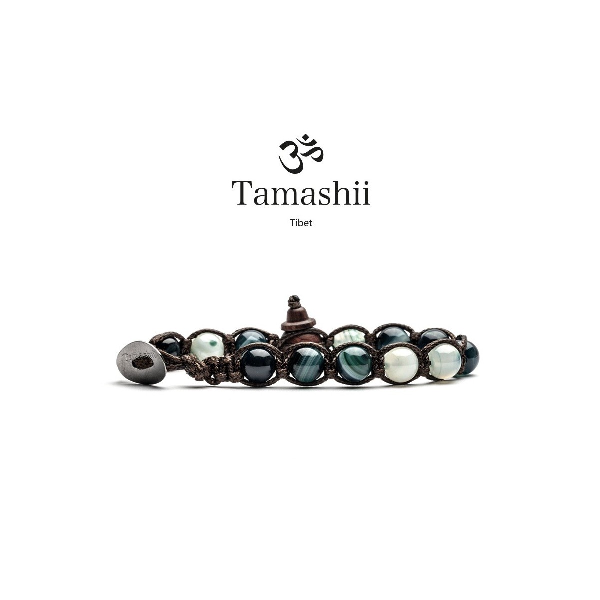 Bracciale a un giro unisex e taglia unica (è predisposto per adattarsi a qualsiasi diametro di polso) composto da pietre di Agata Verde Persia Striate unite da un cordino in cotone cerato. L'agata verde simboleggia equilibrio ed energia e trasforma la gelosia in saggezza di realizzazione. Le striature conferiscono unicità ad ogni pietra e nel contempo sono metafora per l'ugualianza di tutti gli esseri viventi.