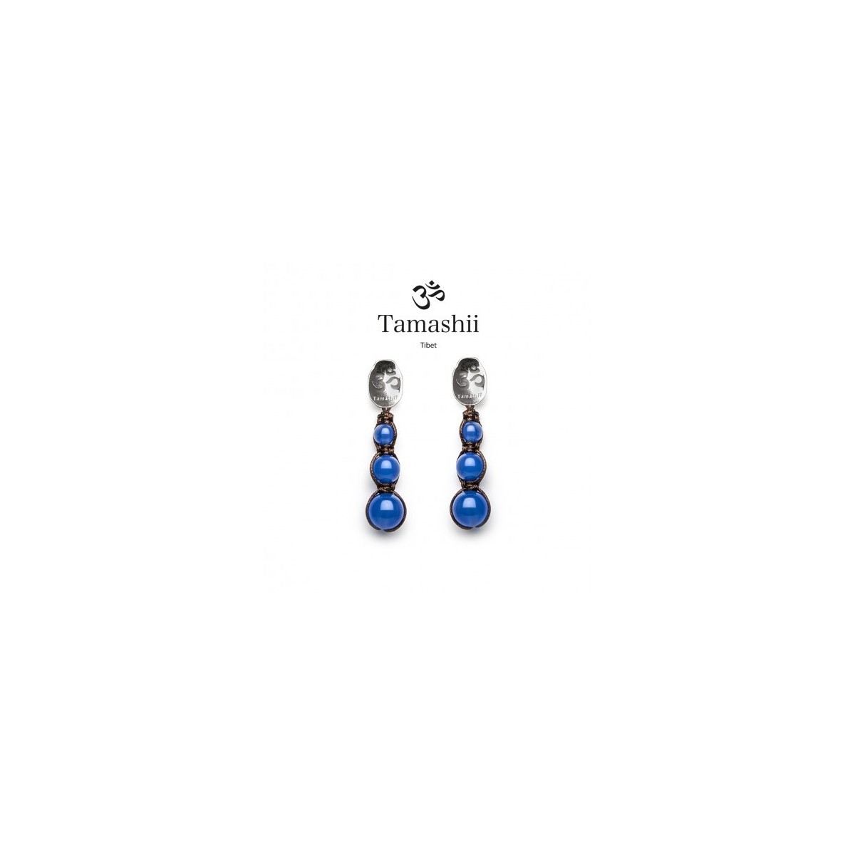Orecchini donna in argento 925 con chiusura a farfalla e tre pietre di Agata blu unite tra loro con un cordino in cotone cerato. Essendo il Blu il colore più importante nel buddismo, simboleggia svariate virtù tra cui la devozione, la purezza, la pace e la fede.