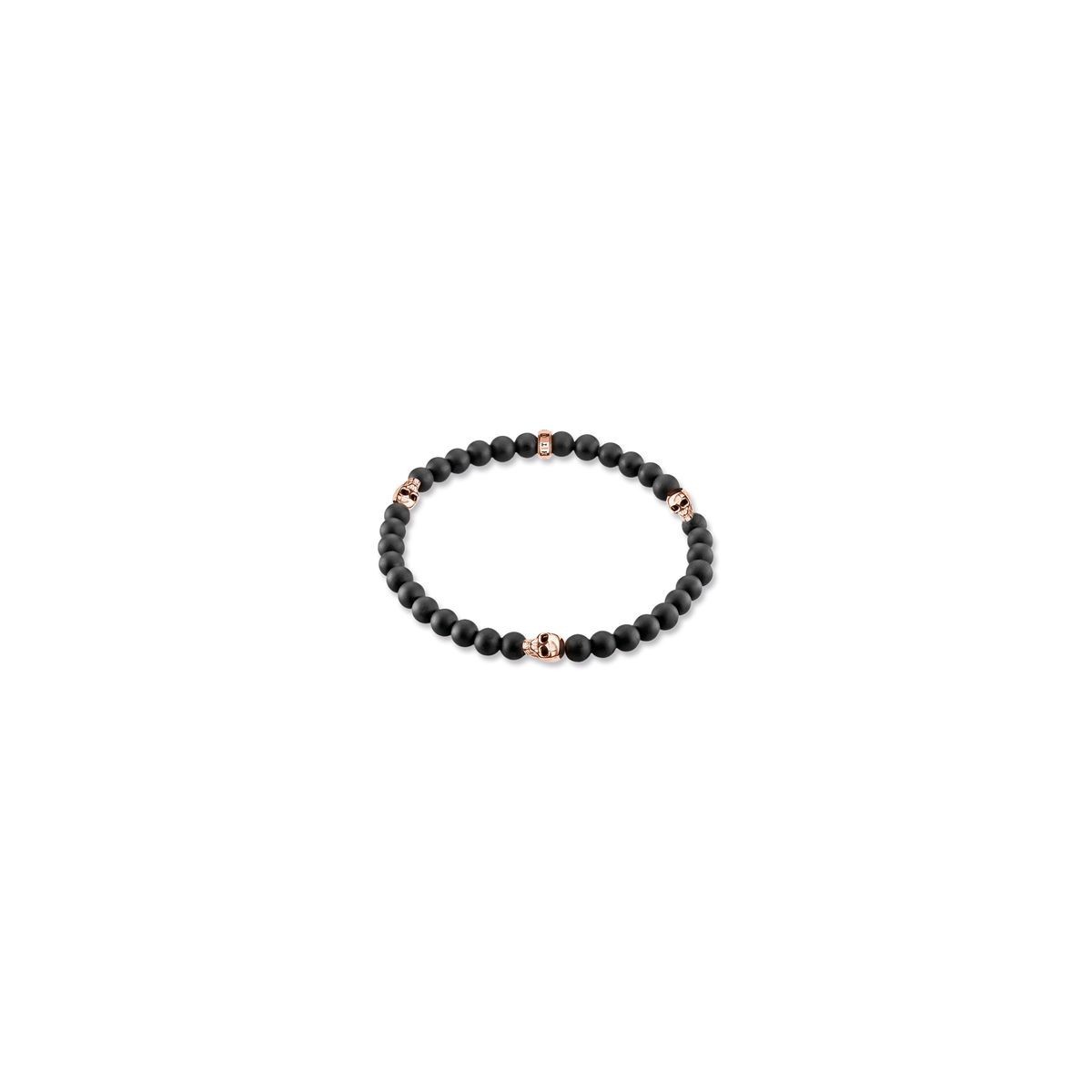 Bracciale elastico linea Rebel at Heart composto da sfere di ossidiana nera satinata e tre componenti a forma di teschio in argento 925 placcato oro rosa 18 carati.