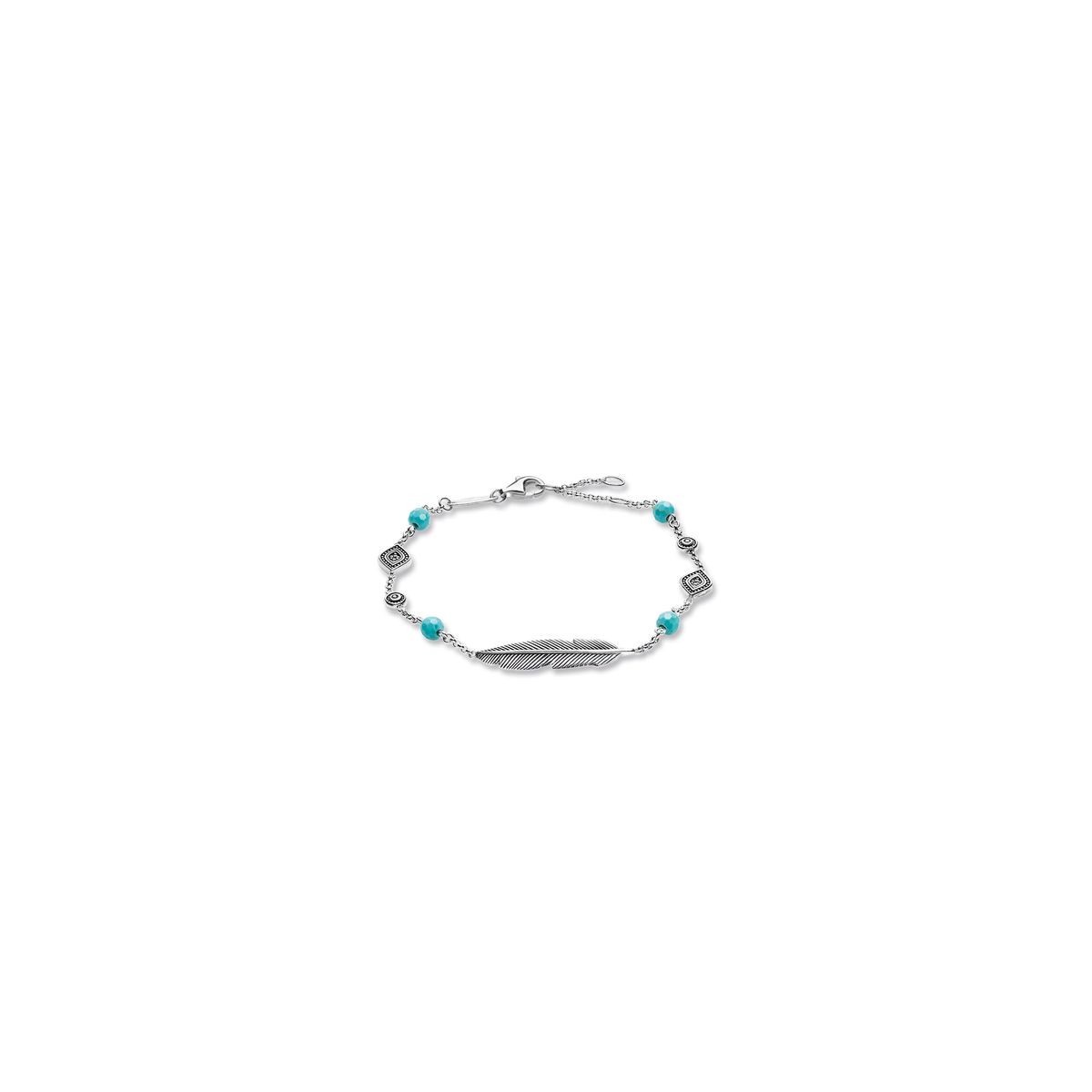 Bracciale linea Glam & Soul in argento 925 niellato, decorato con una piuma e perle di simil turchese sfaccettate e pavè di zirconi sintetici bianchi.Chiusura a moschettone regolabile