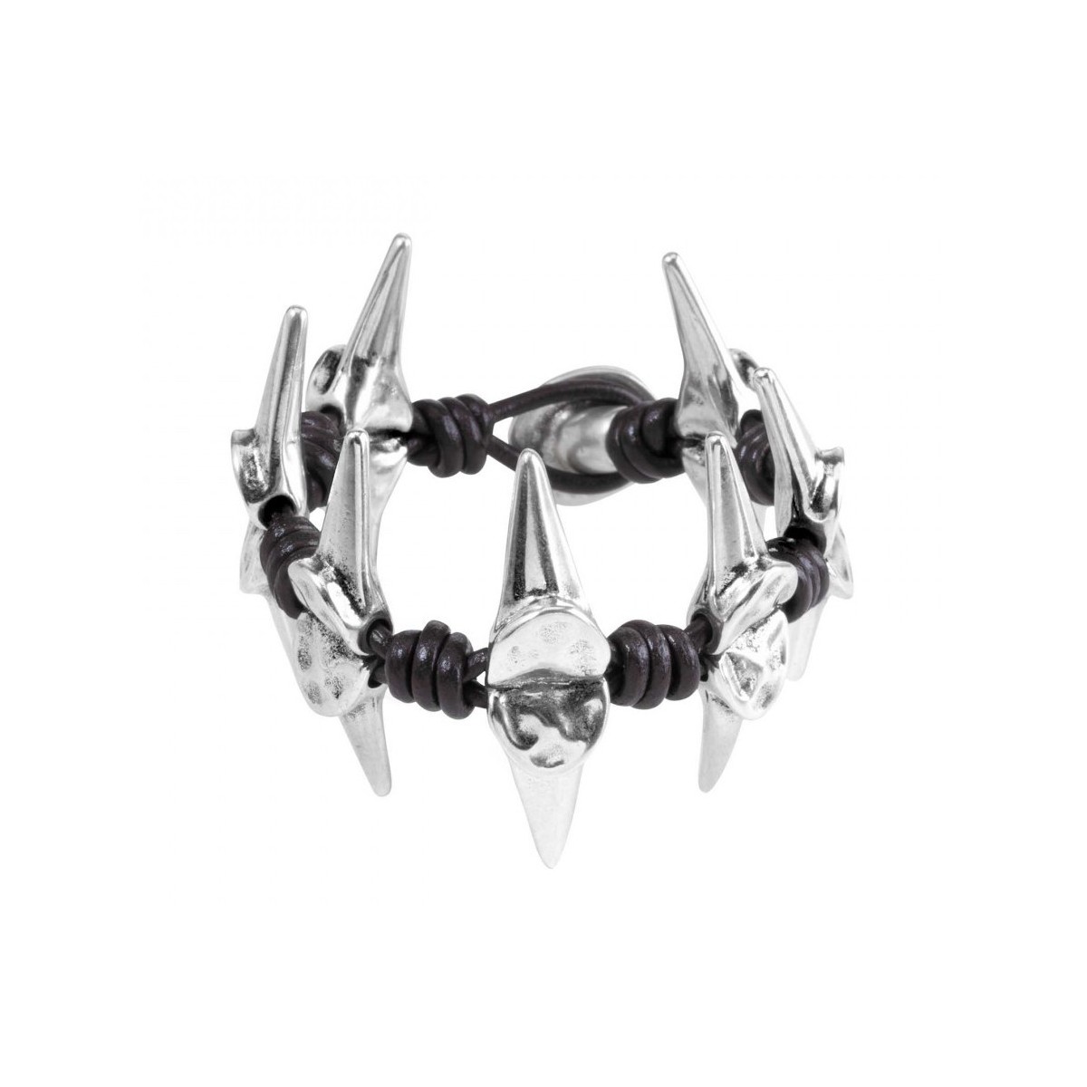 Bracciale unisex pelle marrone scuro annodato e tra un nodo e l'altro dei triangolini in metallo placcato argento; chiusura ad anello in mettalo e pelle