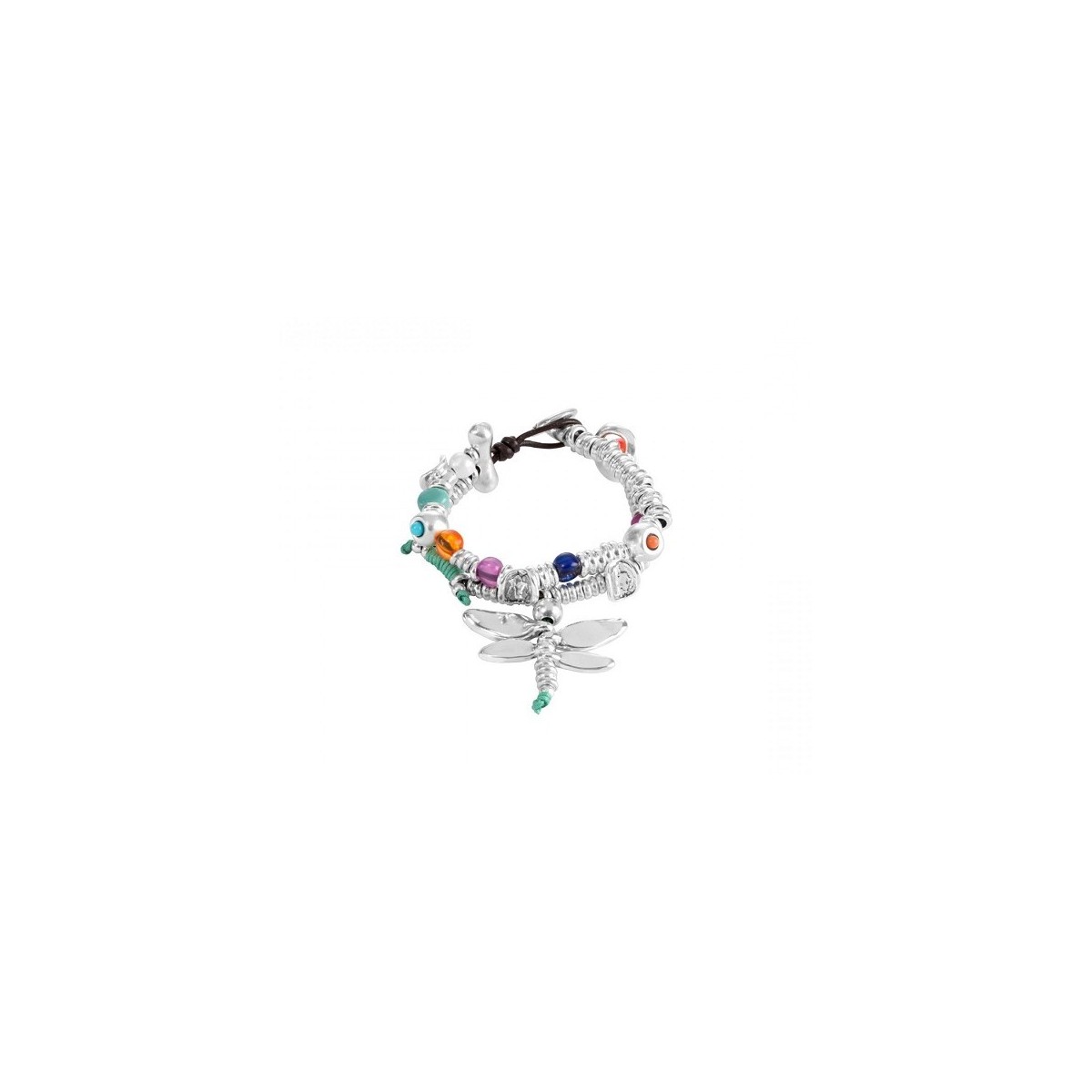 Bracciale donna in metallo placcato argento e vetro colorato con libellula pendente; chiusura logo inciso