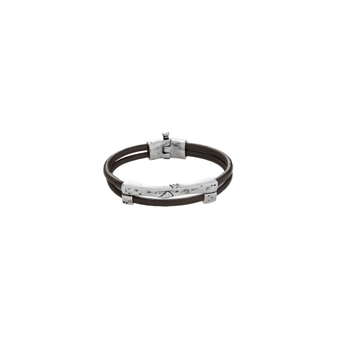 Braccialetto da uomo realizzato con diversi laccetti di pelle marrone e piccole perline placcate in argento. La parte centrale è composta da una struttura allungata argentata dalla superficie irregolare. Un braccialetto fatto a mano da UNOde50 e 100% Made in Spain.