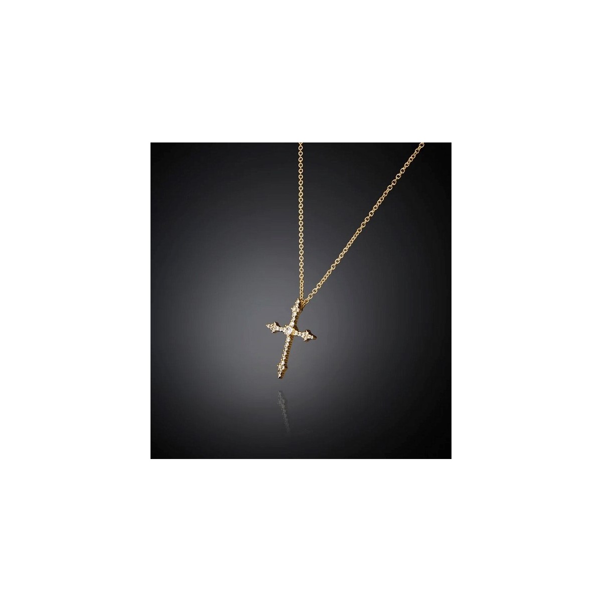 Collana con pendente a forma di croce gotica impreziosita da un pavé di zirconi bianchi, il centrale caratterizzato con l'iconico taglio a cuore. Firmata dalla nota influencer Chiara Ferragni appartenente alla collezione Gothic Cross. Realizzata in metallo placcata oro giallo 18kt. Lunghezza regolabile.