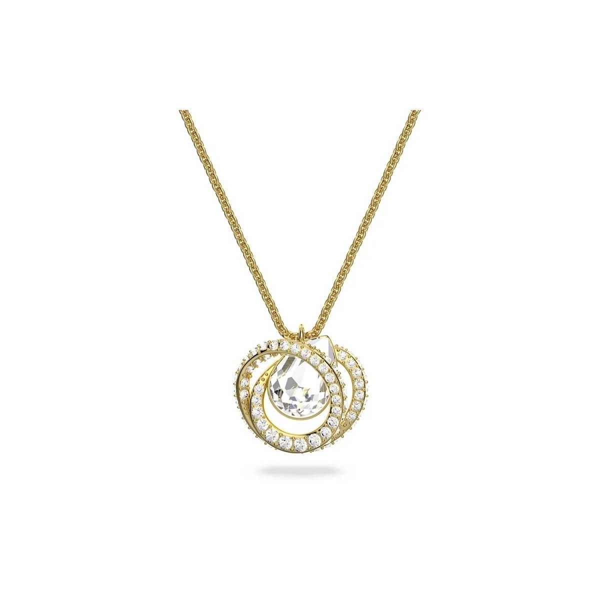 Collana da donna della collezione Generation realizzato in metallo placcato oro giallo con pendente che riprende la tradizione artigianale simbolo dell'azienda austriaca, con cristallo a goccia incastonato all'interno di due cerchi a spirale con pavè di zirconi bianchi.