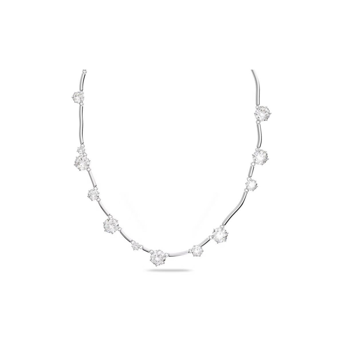 Collana rigida da donna Swaroski appartenente alla collezione Constella. Realizzato su una montatura placcata rodio ed impreziosito da alternanza di piccoli cristalli bianchi dal taglio rotondo e di diverse dimensioni che donano luce al viso di chi li indossa.