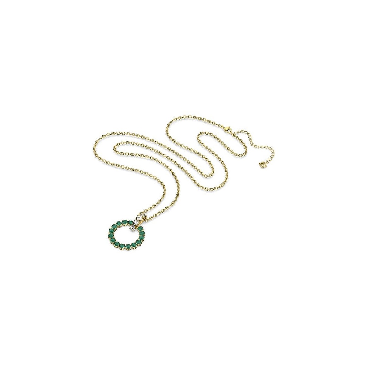 Collana Swaroski appartenente alla collezione Exalta. Realizzata da una catena placcata color oro, con pendente a cerchio intrecciato di colore verde vivace e cristalli trasparenti incastonati su una catena.