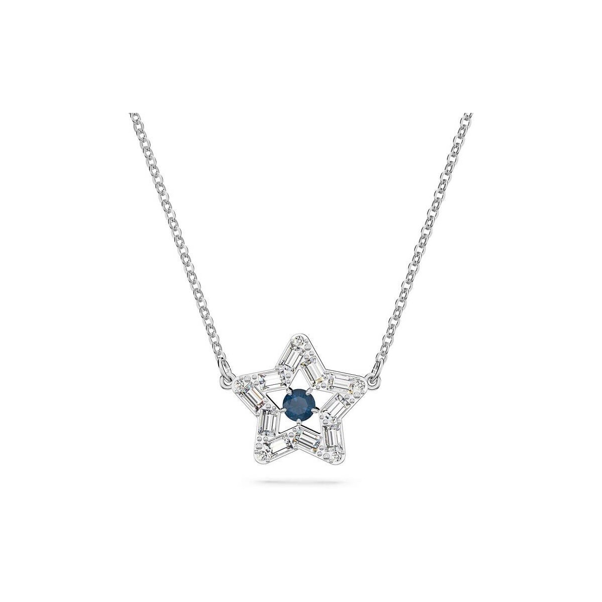 Collana da donna Swaroski appartenente alla collezione Stella, realizzata da pendente motivo stella composto da un elegante zircone di colore blu centrale impreziosito da pavè di cristalli montati a griffe su placcatura rodio.