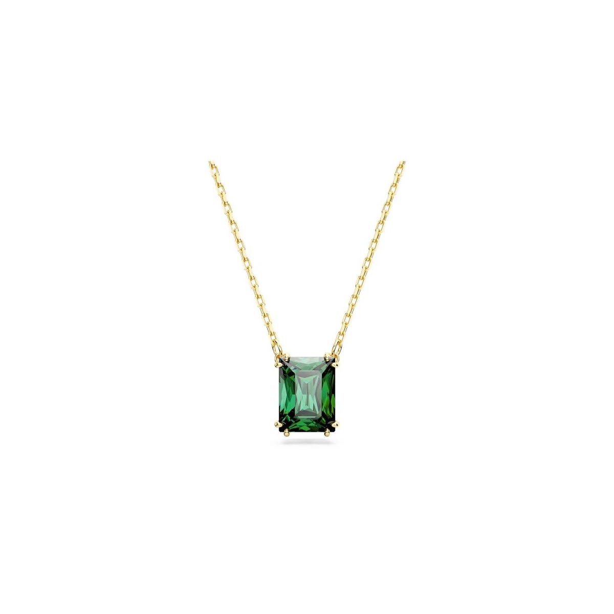 Collana da donna Swarovski, della collezione Matrix, ciondolo rettangolare nella tonalità smeraldo su una montatura a doppia griffa. Viene fornito su una lunga catena placcata color oro. Chiusura a moschettone con allungamento.
